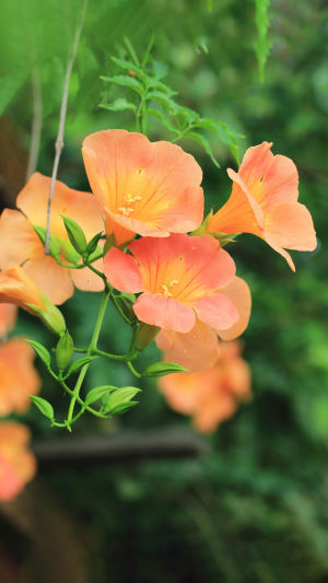 Vines: Campsis grandiflora is a vigorous climbing plant, with its vines rapidly ascending and intertwining with surrounding supports, occasionally reaching lengths exceeding 10 feet (3 meters). These vines are adorned with spiral tendrils that facilitate the plant's upward journey.